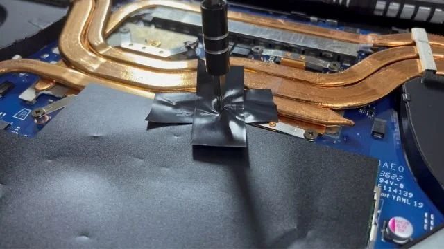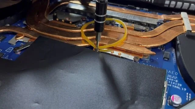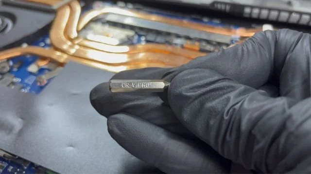 The heatsink, a critical component for cooling the laptop, often uses very thin screws. Their petite size, combined with the need for secure fastening due to the importance of the component, increases the risk of these screws becoming stripped. Moreover, regular maintenance of the heatsink, involving removing and replacing these screws, adds to their vulnerability.