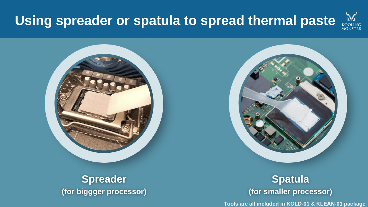 The best way to go about the situation is to use a specialized thermal paste application tool. Luckily, Kooling Monster’s products come with a spreader and a spatula that you can use for this job. It would be more efficient to spread thermal paste on a bigger size processor with a spreader and on a smaller size processor with a spatula.