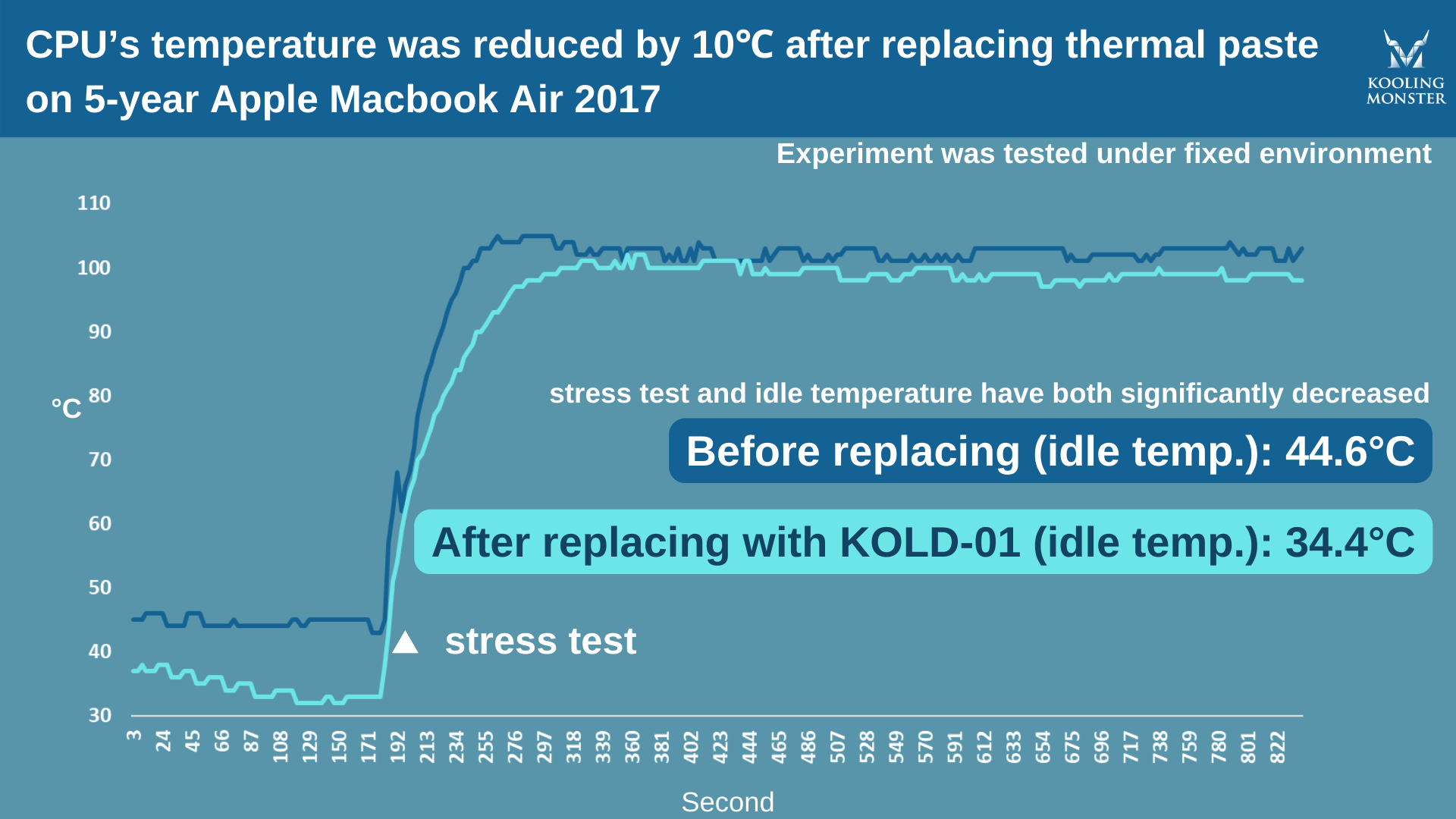 To make it clearer, we performed stress tests on a 5-year-old Apple MacBook Air 2017, before and after applying the new thermal paste. For this test, we used our very own Kooling Monster KOLD-01 thermal paste.