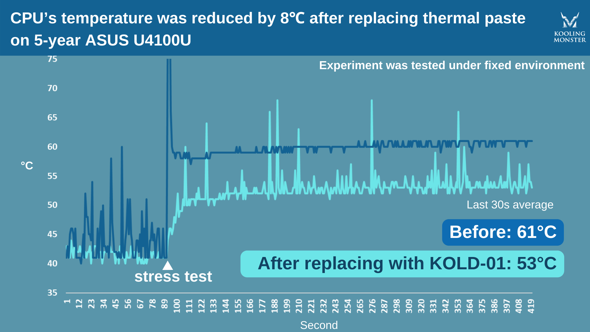 To make it clearer, we performed stress tests on a 5-year-old ASUS ZenBook U4100U, before and after applying the new thermal paste. For this test, we used our very own Kooling Monster KOLD-01 thermal paste.