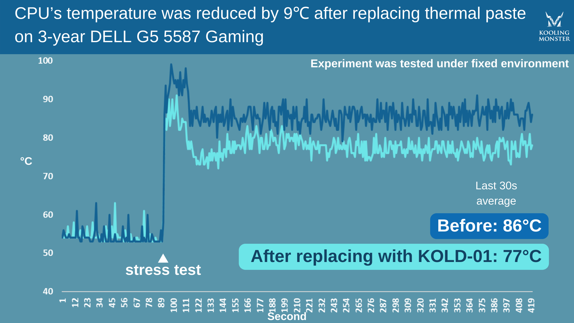 To make it clearer, we performed stress tests on a 3-year-old Dell G5 5587 Gaming, before and after applying the new thermal paste. For this test, we used our very own Kooling Monster KOLD-01 thermal paste.
