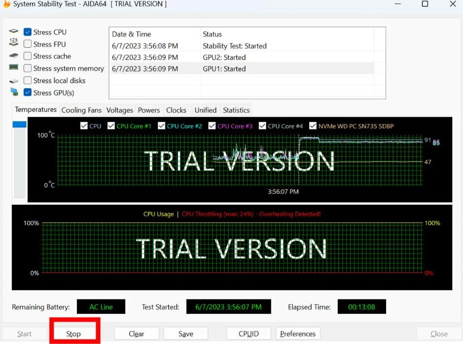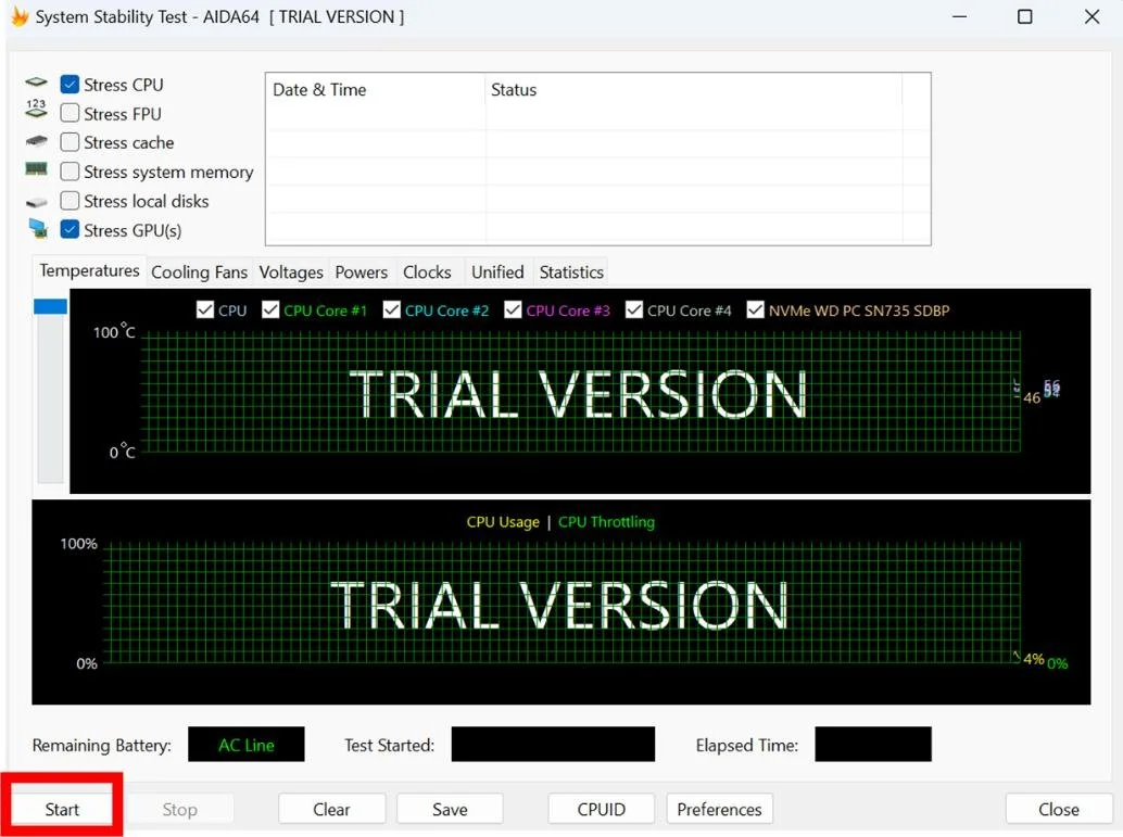 13. Click "Start" on AIDA64 to initiate the stress test. An immediate increase in CPU and GPU temperatures signifies that the test is working. Allow this test to run for approximately 15 minutes to capture stable results.