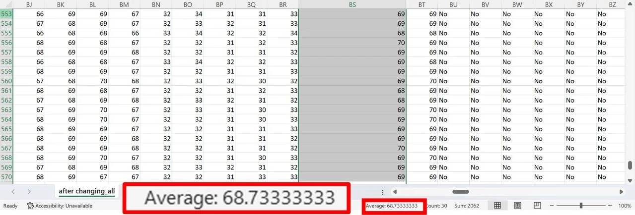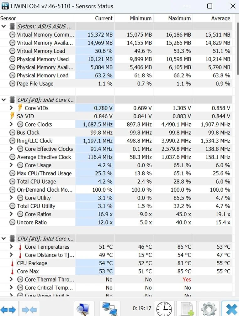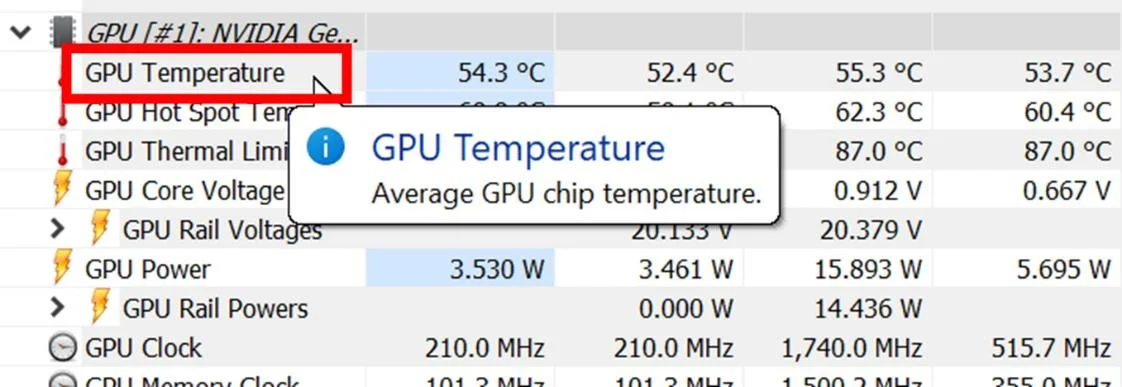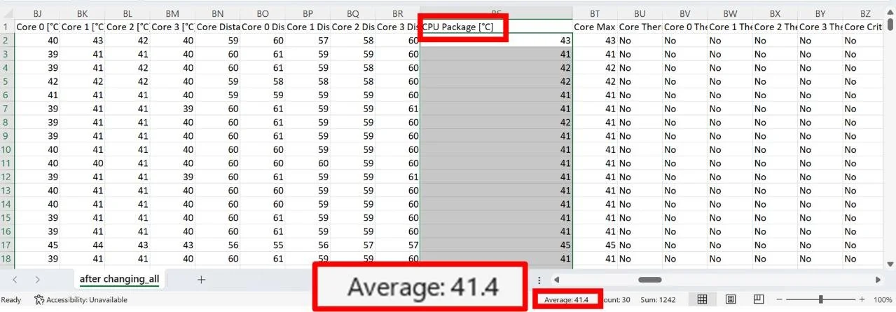 15. Navigate to the file saved from HWiNFO to review your dataset. Look for CPU package temperature and GPU temperature. The first 30 rows will reveal average idle CPU and GPU temperatures, while the last 30 rows provide average temperatures under heavy load.
