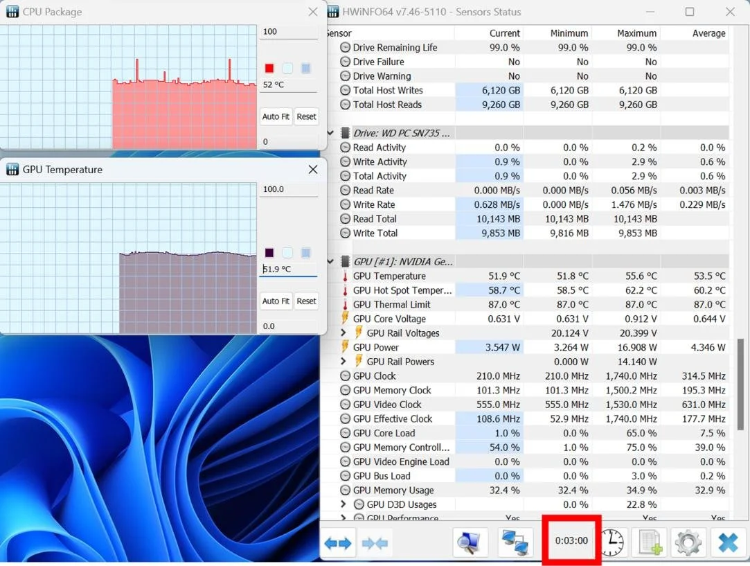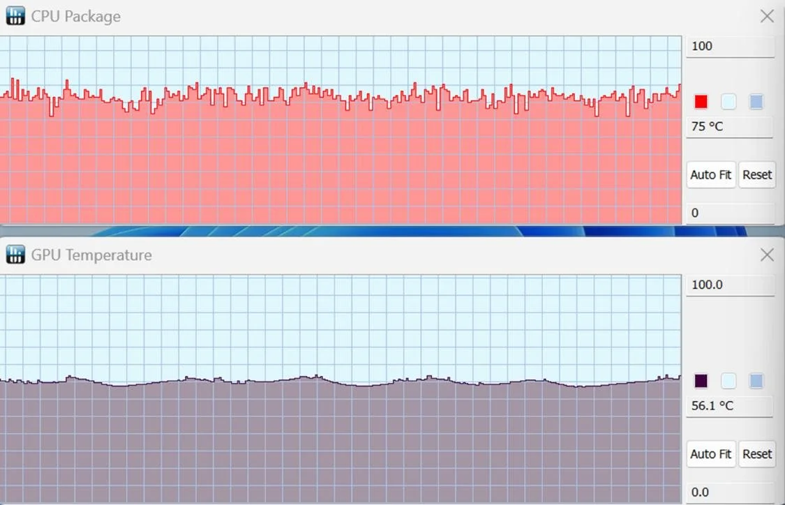 4. Double-clicking “CPU package” and “GPU temperature” will produce a graphical representation of temperature changes over time, giving insight into the CPU/GPU temperature dynamics under idle conditions (we recommend using “CPU package” and “GPU temperature” as they represent the average temperatures on the chips).