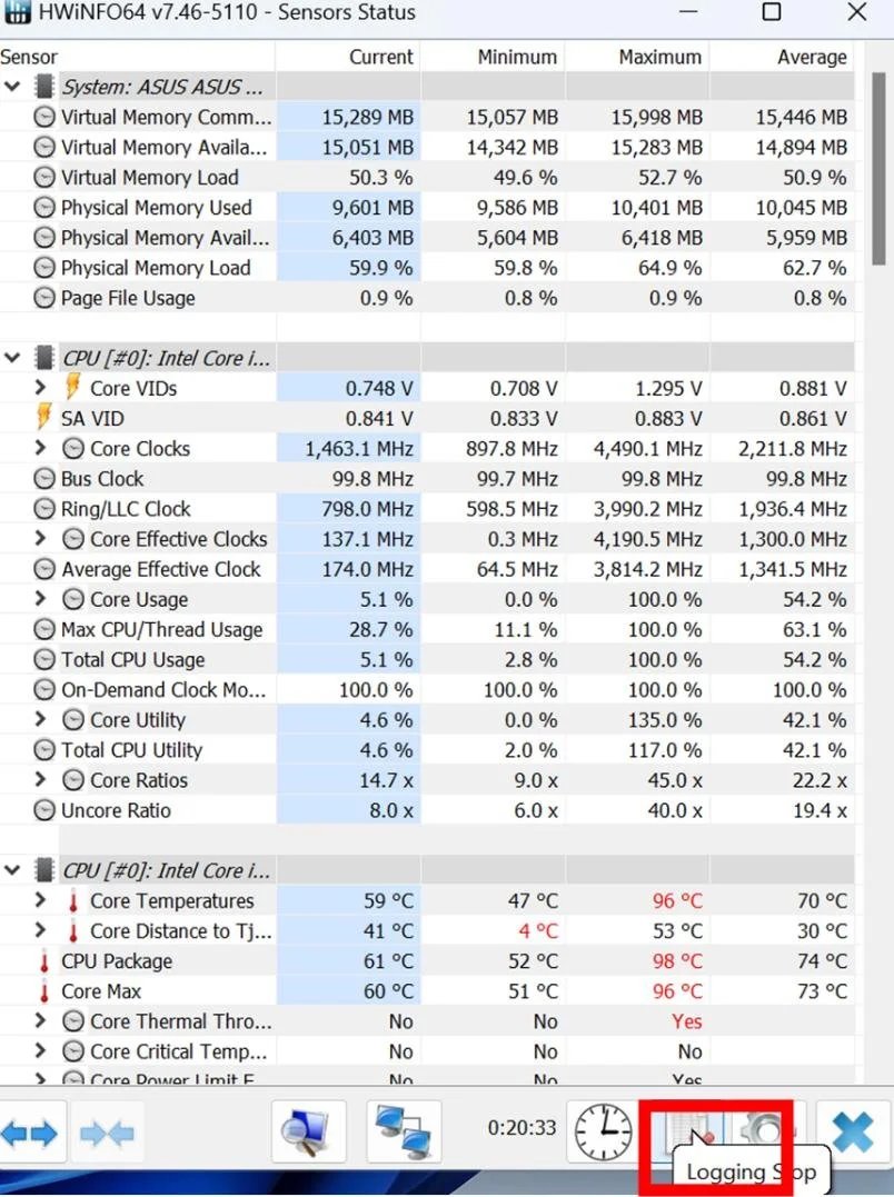14. After the test duration, click "Stop" on AIDA64 to cease the stress test, and simultaneously end the temperature recording in HWiNFO by clicking “Logging Stop”.