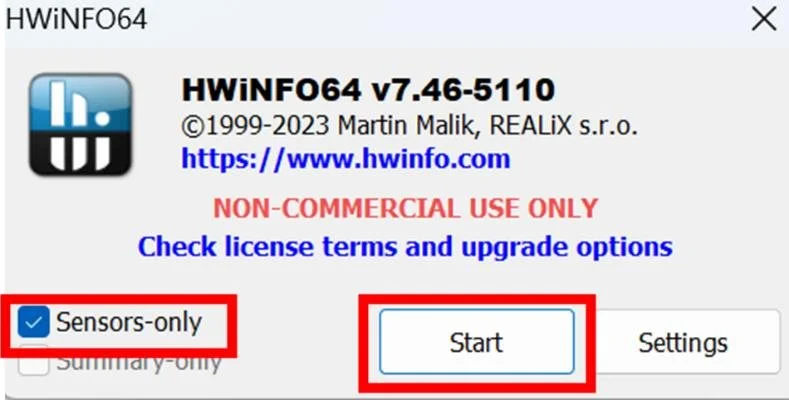 3. Once installed, open HWiNFO in the “Sensors-Only” mode to view your system's sensors, including your CPU and GPU temperature.