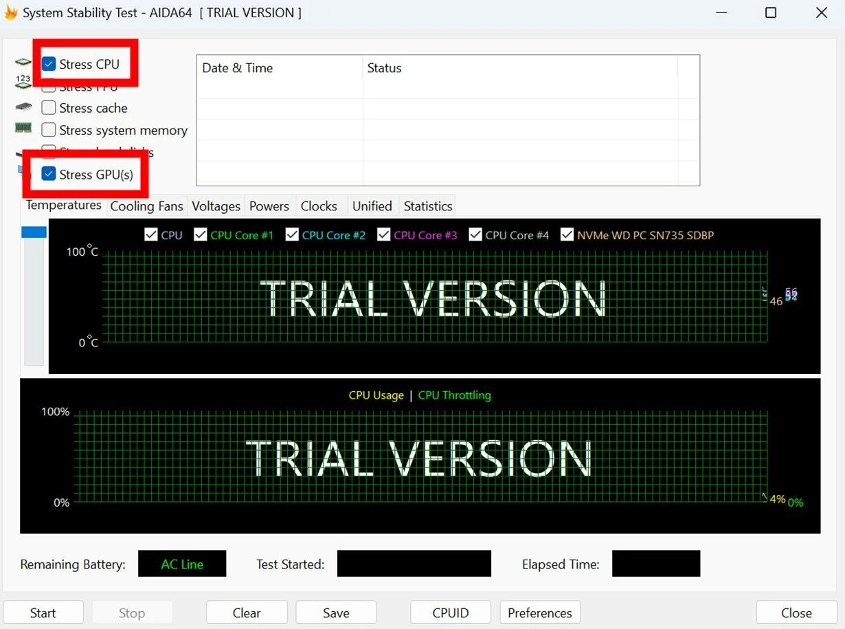 9. Within the stability test, make sure to check the boxes next to "Stress CPU" and "Stress GPU(s)" to include these components in the test.