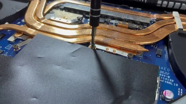 The heatsink, a critical component for cooling the laptop, often uses very thin screws. Their petite size, combined with the need for secure fastening due to the importance of the component, increases the risk of these screws becoming stripped. Moreover, regular maintenance of the heatsink, involving removing and replacing these screws, adds to their vulnerability.