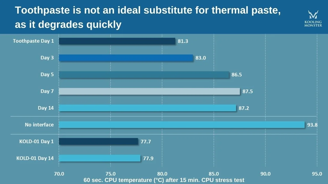 This experiment clearly illustrates the limitations of toothpaste as a thermal paste substitute. Though it might seem like a clever workaround, toothpaste doesn't possess the right properties to maintain long-term CPU cooling performance. Consequently, thermal paste should always be the first choice for effective heat management.