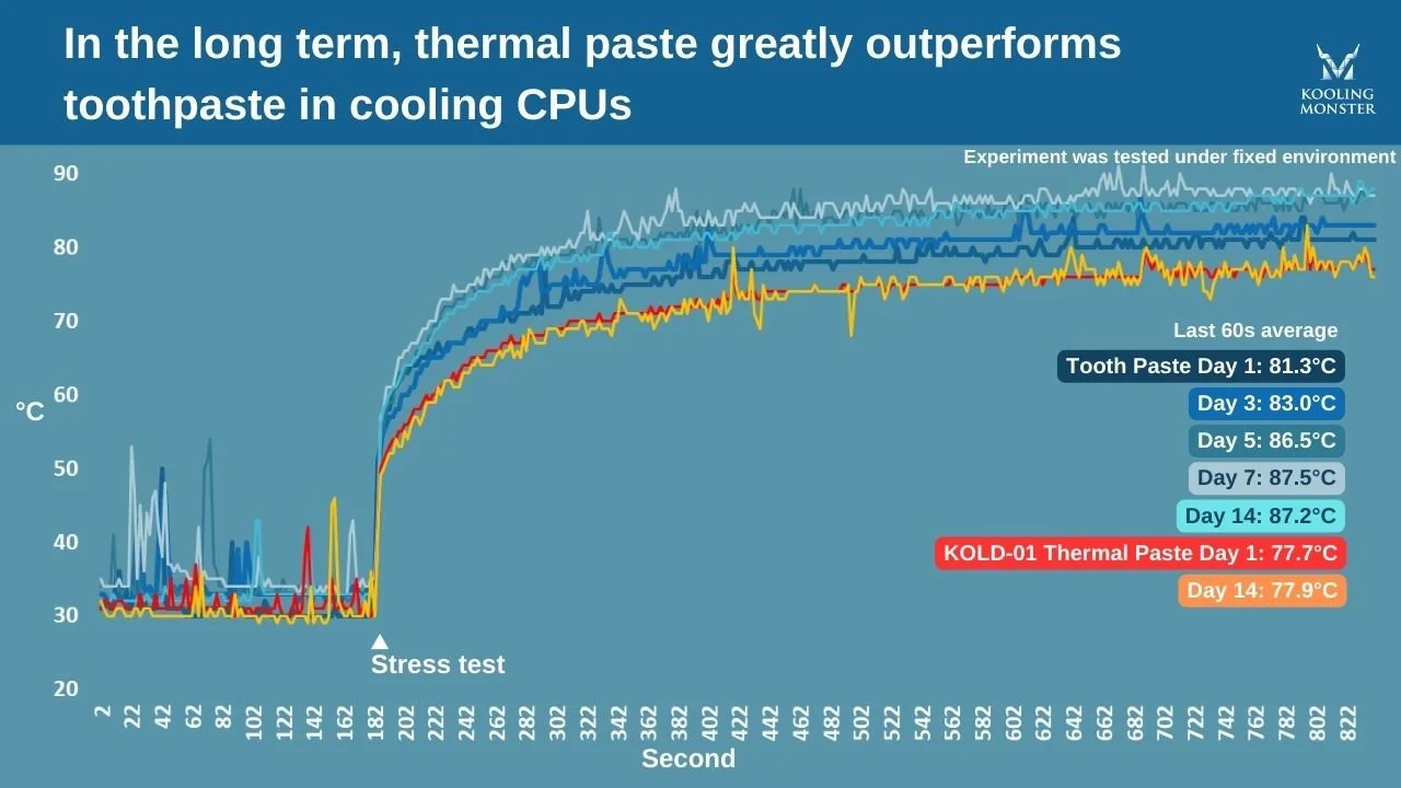 We carried out a 15-minute stress test on the PC for seven consecutive days and then on the 14th day. We recorded the average CPU temperature during the final 60 seconds of each test. This allowed us to assess the heat transferability of both toothpaste and thermal paste.
