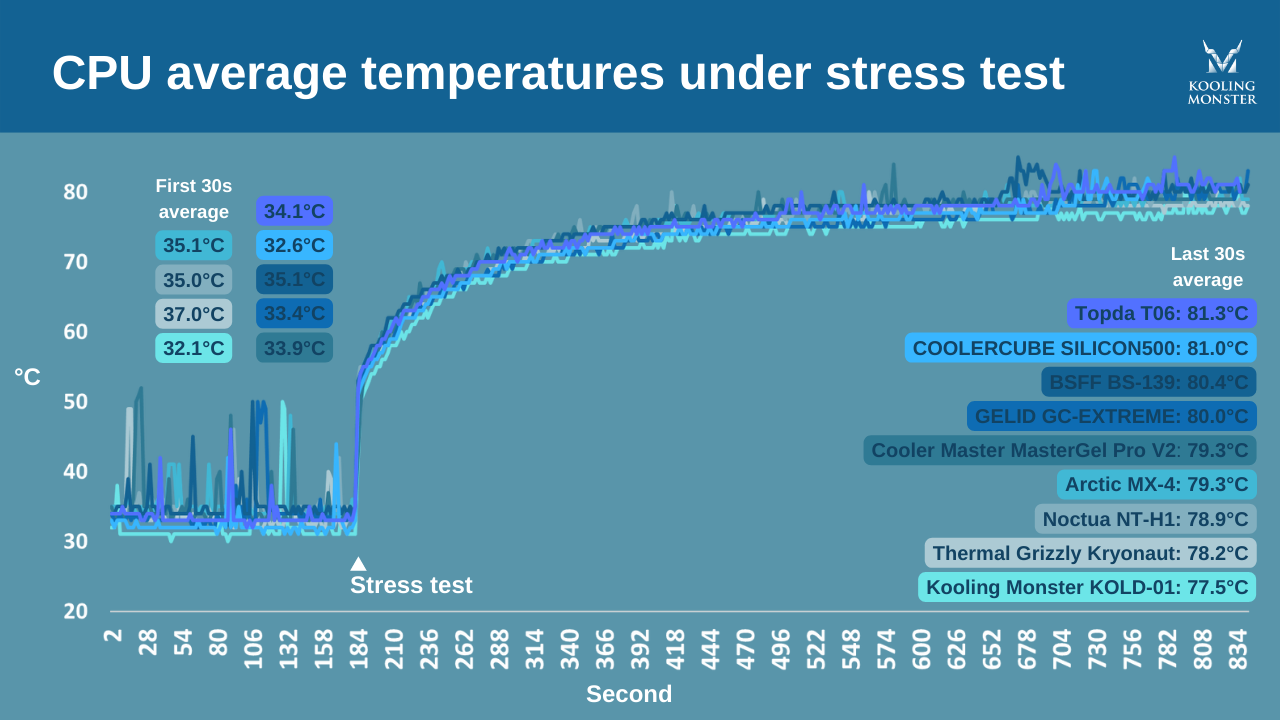 For this experiment, we gathered 12 name-brand thermal pastes, along with our own Kooling Monster KOLD-01 and ran them individually through a 15 minute stress-test using special software. Then, using a different software, we took a 30-second average of the CPU temperature and compared the numbers. The top three were Kooling Monster KOLD-01, Thermalright TF7, and Thermal Grizzly Kryonaut, clocking in at 77.5°C, 77.8°C, and 78.2°C respectively.
