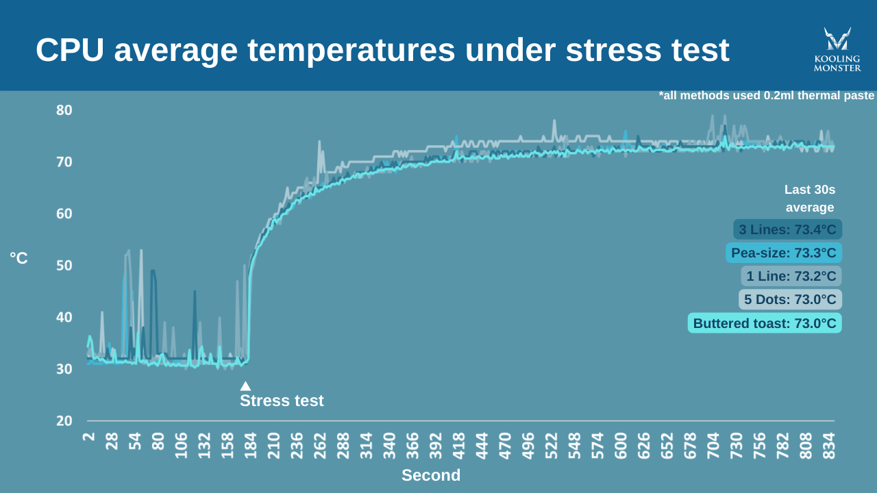To clear this up, we performed a case study where we tested the thermal performance in different circumstances. Normally, such tests don’t take into account the duration of the stress test and the different amounts of thermal paste you could use.