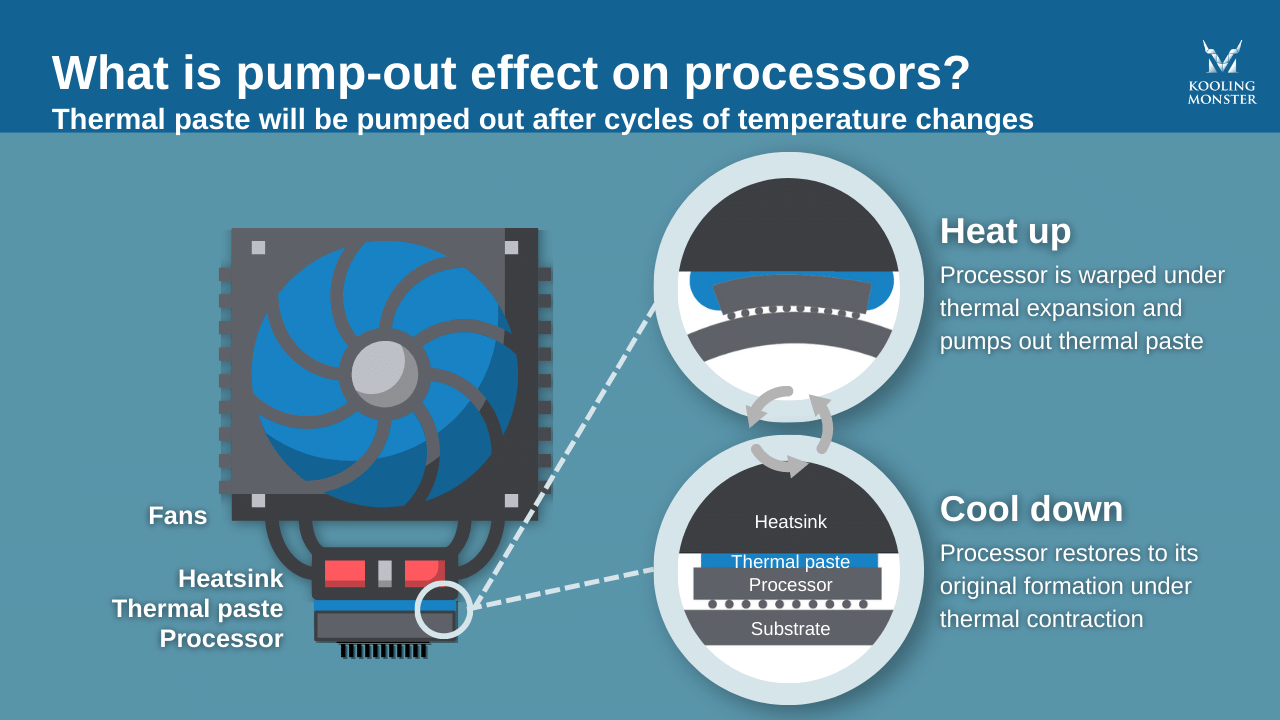 Simply put, pump-out means that the thermal paste gets pumped out from the central processor. This happens when there are temperature changes, and the substrate and processor get warped at the microscopic level, and they gradually move that thermal paste outward. Generally, the processor will have many cycles where it heats up, then it cools down.