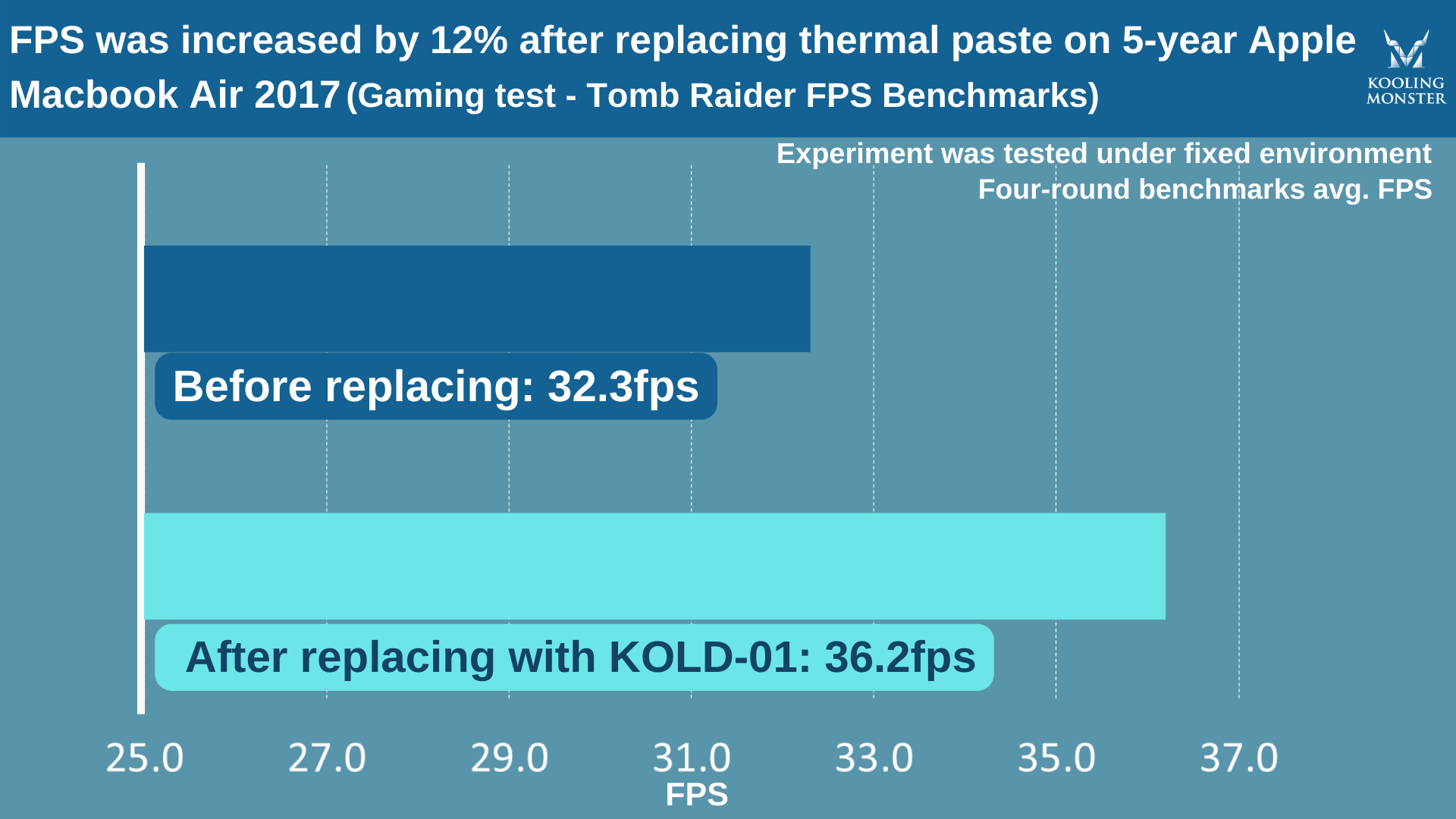 To explore how thermal paste can supercharge the FPS performance of Tomb Raider gameplay, we conducted four rounds of benchmark. The average frame rate increased from 32.3fps to 36.2fps after changing the thermal paste.