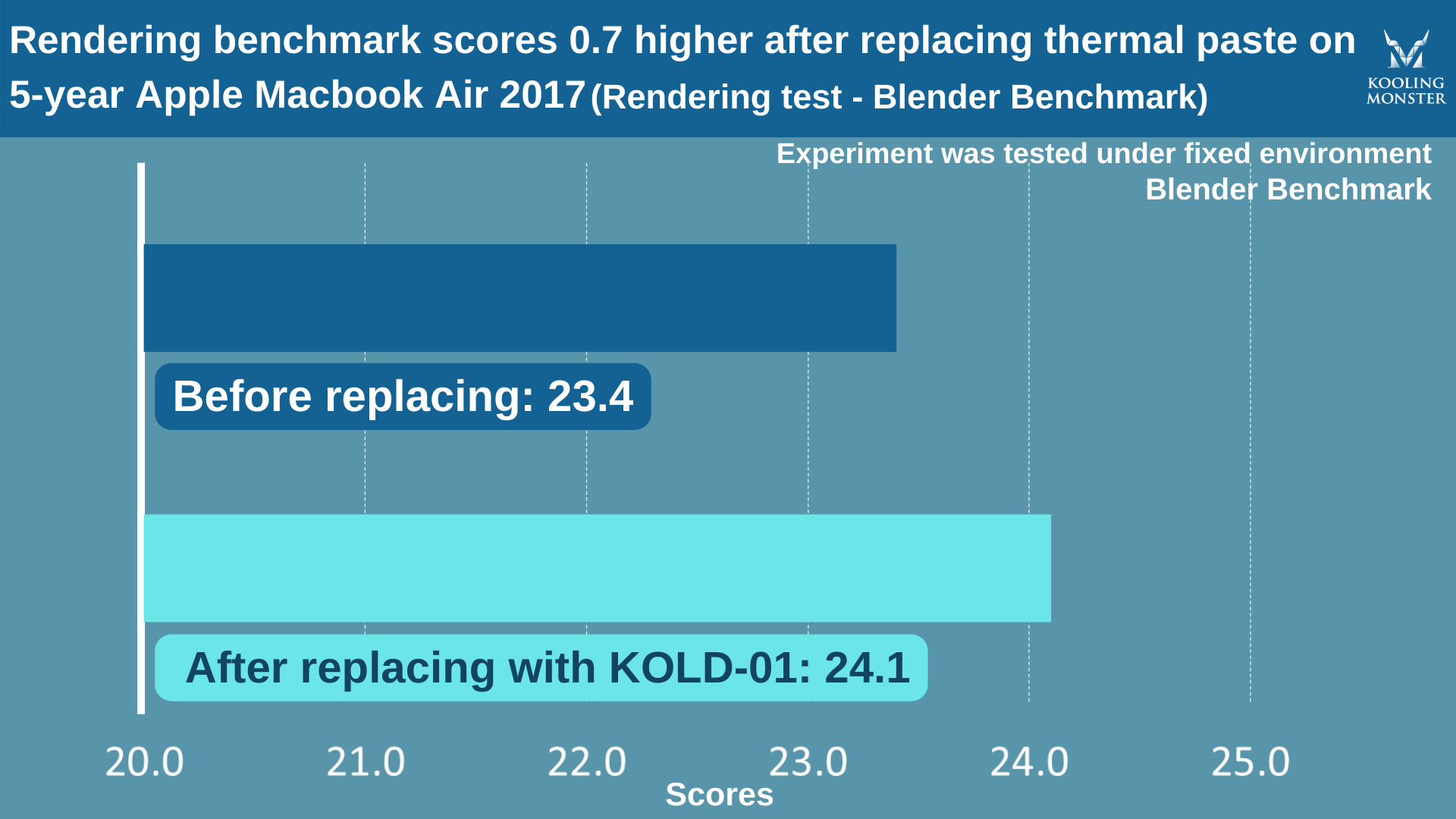 To make it clearer, we performed stress tests on a 5-year-old Apple MacBook Air 2017, before and after applying the new thermal paste. For this test, we used our very own Kooling Monster KOLD-01 thermal paste.