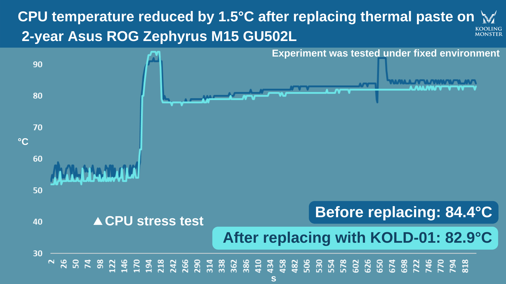To make it clearer, we performed stress tests on a 2-year-old Asus ROG Zephyrus M15 GU502L, before and after applying the new thermal paste. For this test, we used our very own Kooling Monster KOLD-01 thermal paste.