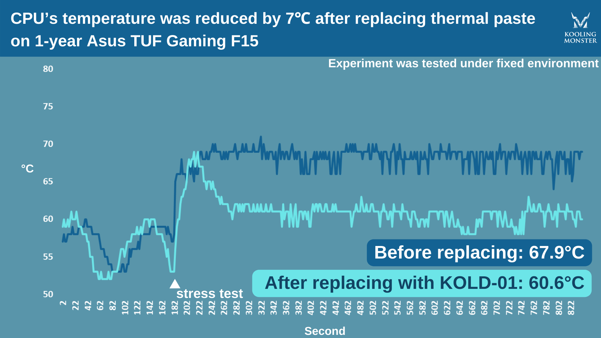 To make it clearer, we performed stress tests on a 1-year-old Asus TUF Gaming F15, before and after applying the new thermal paste. For this test, we used our very own Kooling Monster KOLD-01 thermal paste.