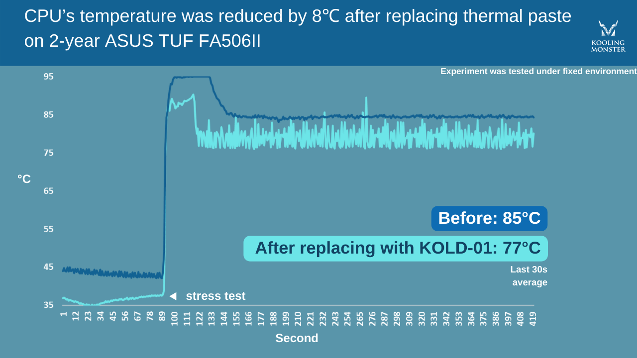 To make it clearer, we performed stress tests on a 2-year-old ASUS TUF Gaming FA506II, before and after applying the new thermal paste. For this test, we used our very own Kooling Monster KOLD-01 thermal paste.