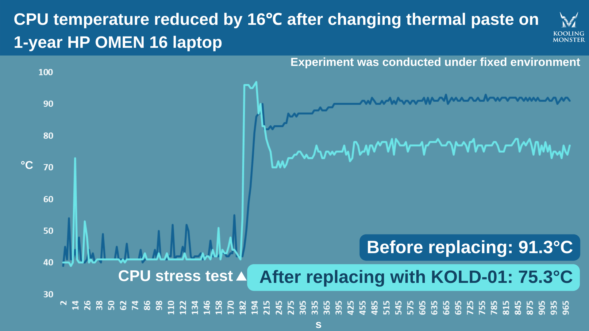 To make it clearer, we performed stress tests on a 1-year-old HP OMEN 16, before and after applying the new thermal paste. For this test, we used our very own Kooling Monster KOLD-01 thermal paste.