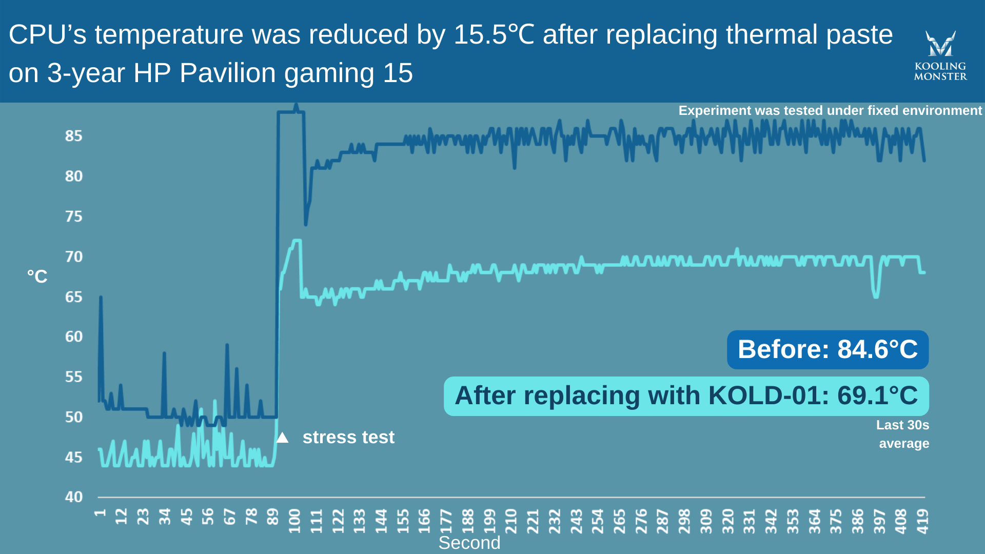 To make it clearer, we performed stress tests on a 3-year-old HP Pavilion Gaming 15, before and after applying the new thermal paste. For this test, we used our very own Kooling Monster KOLD-01 thermal paste.