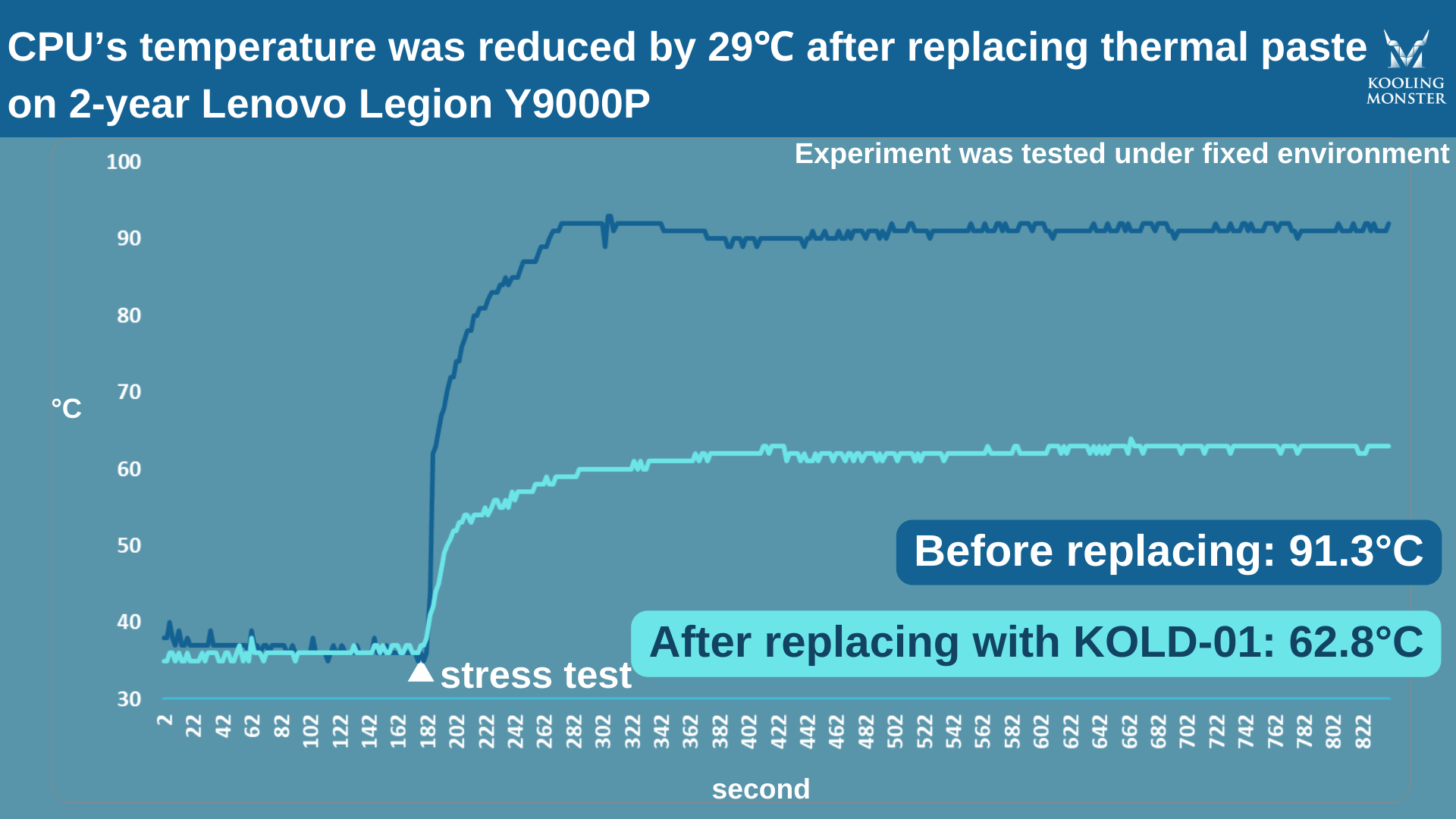 To make it clearer, we performed stress tests on a 2-year-old Lenovo Legion Y9000P 2021H, before and after applying the new thermal paste. For this test, we used our very own Kooling Monster KOLD-01 thermal paste.